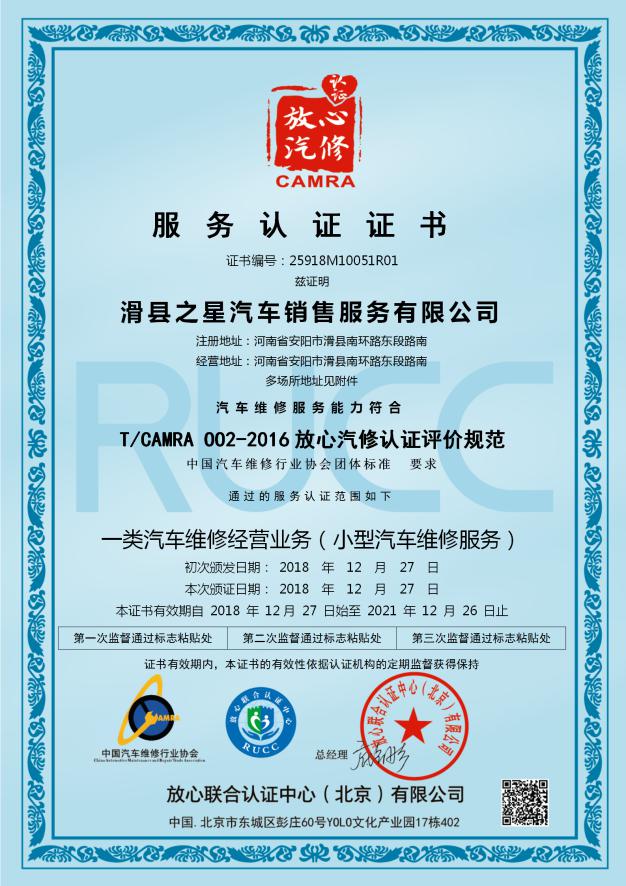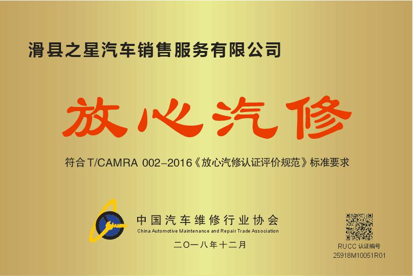 放心汽修認(rèn)證證書(shū)