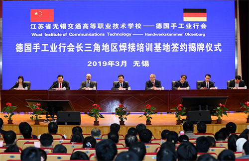 3月26日,無錫交通高等職業技術學校與德國手工業行會(HWK)長三角地區焊接培訓基地簽約揭牌儀式在無錫交校舉行。省交通運輸廳副廳長金凌,德國手工業行會奧登堡主席庫爾曼先生、會長漢克先生等出席活動。