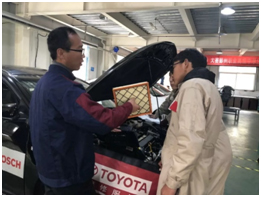 通渭職專受訓教師到達寧波后,鄞州職高對他們實行一對一師徒結對,教研組分階段對其考核,力求每個培訓模塊內(nèi)容都完全落地并且被吸收。第一位到校接受培訓的田振軍教師,他的結對教師是鄞州職高的王瑞軍老師,一個月時間,田老師把汽車二級維護365個項目全部做了一遍,并且在不斷練習的同時積極思考。教學上,田老師是每節(jié)課都去教室,聽課觀摩學習,探索教學方法,最后以《更換空氣濾清器芯》為例開設了一堂公開課。而在田老師學習的這一個月中,王老師幾乎全程參與田老師的訓練、考核、開課以及磨課等環(huán)節(jié),適時給與指導幫助。鄞州職高汽修部其它汽修教師也都主動參與這個項目中,接受受訓教師隨時隨地的聽課,有任何需要配合之處,所有老師無一例外都是真誠相待。