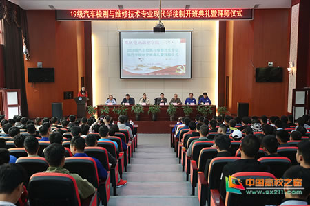 11月4日上午,重慶電訊職業學院2019級汽車檢測與維修技術專業現代學徒制開班典禮暨拜師儀式在學術報告廳舉行。副校長栗玉俠、教務處處長季漢濤、教學總監覃漢基、重慶工匠汽車銷售服務有限公司法人、董事長熊大偉,總經理黃云明,汽車與智能制造工程學院院長周山泉、書記王紅章、副院長李正新出席本次典禮。