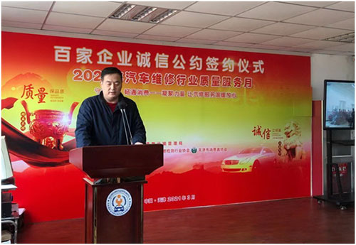 企業代表、天津市柯蘭德汽車銷售維修服務有限公司總經理李合芳代表全體參會企業發言,表示要堅持誠信為本,以優質服務、用戶滿意為宗旨參與市場競爭,公正簽訂并忠實履行汽車維修合同(托修單),不擅自減少作業項目,不使用假冒偽劣配件,不作虛假廣告宣傳。