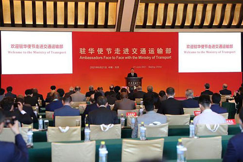 2021年6月21日,交通運輸部舉辦的“駐華使節走進交通”活動在北京舉行。此次活動是外交部組織的“駐華使節走進中國部委”系列參訪活動的第二站,交通運輸部部長李小鵬出席活動,并與130多位駐華使節和國際組織駐華代表就交通運輸改革發展進行了深入的互動交流。
