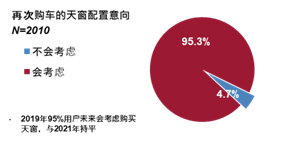 受訪用戶表示在購車考量的配置中,天窗是重要的選項,占比為70%,低于倒車影像居第二位。用戶未來購車選購天窗意愿比例為95.3%,比2019年有所上升,居于高位,94.3%的用戶傾向于可開啟天窗,固定式不可開啟全景天窗的比例為5.7%,比2019年略微增加。在購車時,用戶在喜歡的車型有固定玻璃和可開啟天窗可選的情況下,只有2.1%的用戶選擇了固定式不可開啟天窗。在喜歡的車型只有固定玻璃可選的情況下,已經使用過可開啟天窗的用戶只有42.6%會購買,低于2019年的64%。