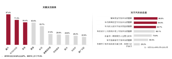 用戶購買天窗的行為中關注最多的是通風、光線和安全,與2019年相比,安全的關注度有提升。在對于汽車的態度環節,受訪者認為安全、新鮮的空氣和光線很重要,與天窗的主要關注因素一致。