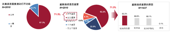 本次調研總體用戶中,87.3%的用戶需要天窗具有滑動打開功能,71.5%用戶重視天窗遮陽系統,與2019年基本持平;認為重要的主要原因是能防曬隔熱。如果車頂采用了能隔熱防曬的玻璃,仍有43.4%的用戶表示需要遮陽簾。