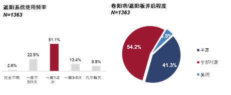本次調研中,96.2%的天窗用戶配備了遮陽系統;遮陽系統的利用率提高,97.2%的用戶會使用遮陽系統,明顯高于2019年的87%;51.1%的用戶一周使用一次,總體來看較2019年使用頻率有所提升。