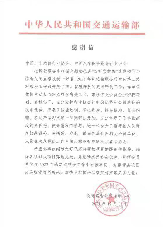 2021年末,中國汽車維修行業協會收到來自交通運輸部運輸服務司的感謝信,感謝我會按照部有關定點幫扶統一部署,積極主動參與部運輸服務司牽頭的第三結對幫扶工作組,充分發揮行業協會的組織優勢和會員單位的技術優勢,開展對四川省壤塘縣幫扶工作安排,帶領有關會員企業積極謀劃、真抓實干,開展了技能培訓、學生資助、設備捐助、現金捐贈、農副產品購買等一系列幫扶活動。其中會員單位比亞迪汽車銷售公司和上海闌途信息技術有限公司(途虎養車)、黑龍江省汽車維修和檢測行業協會等分別對教書育人的山區教師提供了獎勵補助專項資金,有力支持了結對幫扶教育工作;南京汽車維修行業協會、東風本田汽車有限公司、中車時代電動汽車股份有限公司等單位捐贈了車用潤滑油,以支持壤塘縣車輛運輸服務事業;北京福田戴姆勒汽車銷售有限公司“點亮鄉村路”項目給山區居民帶來了更多溫暖和責任。