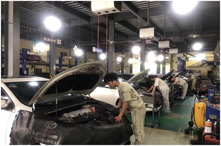 公司嚴格按照高標準的廣州豐田汽車銷售店修建。設施配套齊全,配備4個保養/維修接待工位、16個維修工位、10個鈑金工位、2個烤漆房,另外配備客戶休息區、停車場、餐廳、員工休息室等。無論從外觀設計、購車環境、硬件設施、人員素質、服務效率等,力求為客戶提供完美的服務體驗。