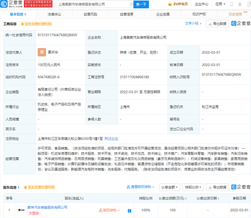 3月1日,上海首蔚汽車維修服務有限公司成立,法定代表人為夏慶華,注冊資本100萬元人民幣,經營范圍包含:新能源汽車電附件銷售;洗車服務;代駕服務等。企查查股權穿透顯示,該公司由蔚來汽車銷售服務有限公司100%控股。