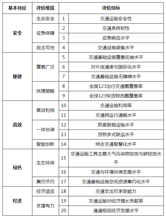 綜合考慮各地區、各行業特點,注重交通運輸與經濟社會、生態環境相協調,統籌發展和安全,圍繞“安全、便捷、高效、綠色、經濟”,從“基本特征、評價維度、評價指標”三級設置20項評價指標。相應設置部分表征指標,供行業、地方制定指標參考,具體見附件