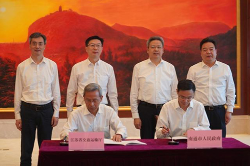 6月27日上午,江蘇省交通運輸廳與南通市政府簽署共建交通運輸現代化示范區合作框架協議,積極探索交通運輸現代化示范區建設的南通路徑,重點打造濱江臨海全國性綜合交通樞紐的示范、現代化海港的示范和運輸結構調整的示范,支撐南通經濟社會跨越趕超發展。江蘇省交通運輸廳廳長、黨組書記兼省鐵路辦主任吳永宏,南通市委副書記、市長吳新明共同見證項目簽約。江蘇省交通運輸廳副廳長惠先寶,省鐵路辦副主任朱培德,南通市委常委、常務副市長陸衛東,副市長童劍等參加活動。