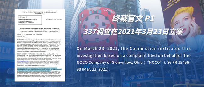 2022年8月29日,ITC法官發布終裁判決:維持初裁判決結論,即美國NOCO公司024專利不滿足國內技術產業要求,卡兒酷不涉及對024專利侵權問題,即Carku產品不侵權。這意味著卡兒酷打贏了勝訴率僅5.2%美國“337調查”,即終裁獲勝。