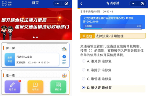 為深入開展 “信用交通宣傳月”活動,營造“誠實守信、一路暢行”的良好氛圍,無錫市交通運輸局依托市交通綜合執法局開發的“無錫交通執法云管家”微信小程序,面向全市交通綜合執法人員開展《江蘇省交通運輸行業信用管理辦法》線上知識問答活動,進一步宣傳信用政策法規,提升信用管理水平。