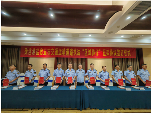 會上,徐連淮鹽宿五市各交通綜合執法支隊、各直屬高速支隊共同簽訂了“區域協作”框架協議以及信息共享等四項機制文件,舉行了五市“交通藍·護衛2024”道路運輸集中日專項行動啟動儀式。徐州、連云港、淮安、鹽城、連徐、宿遷市宿豫區等6家單位圍繞近期“區域協作”工作開展情況進行了交流發言。