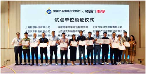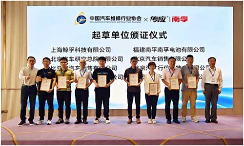 會上相關(guān)領導為標準起草單位、起草人和應用試點單位頒發(fā)證書。先后為南孚電池、北汽、比亞迪、京東養(yǎng)車、途虎養(yǎng)車、北汽研究總院、開思時代等頒發(fā)參編單位證書,為孔瀚毅、魏行凱等頒發(fā)起草人證書,為沈陽南一、沈陽捷利達、濟寧雷聲、安陽建普、西安勁寶力等企業(yè)被頒發(fā)試點單位證書。