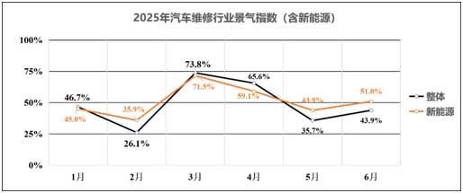 二季度景氣指數呈現高開低走再弱復蘇的態勢:4月(65.6%)同比激增27.8個百分點,但5月驟降至35.7%(單月環比暴跌29.9%),6月小幅回升至43.9%。這與行業常年規律基本吻合——春節后需求集中釋放(3-4月高位),但受"五一"等小長假出行減少、新車交付周期及燃油車消費周期性下滑影響,5-6月傳統淡季效應顯著。值得注意的是,今年4月指數逆勢高企,經數據溯源發現五一節前促銷活動顯著拉升當期指數,與傳統維修企業走勢形成分化。