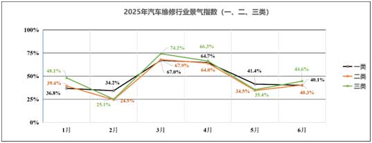 各類汽車維修企業景氣指數結果表明,4-6月份一、二、三類企業汽車維修行業景氣指數總體趨勢保持一致,在5月出現大幅下降,6月出現一定復蘇;其中一類企業景氣指數分別為64.7%、41.4%、40.1%,波動性相對較小,表明市場變化因素對汽車大修和總成修理需求影響較小。