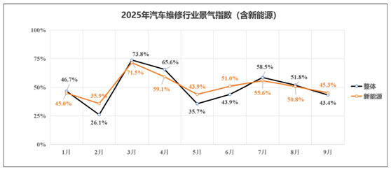 近日,我會聯合大連海事大學綜合交通運輸智能技術與裝備教育部工程研究中心,發布了2025年第三季度汽車維修行業景氣指數。2025年7-9月,景氣指數分別為58.5%、51.8%、43.4%。