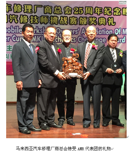 馬來西亞汽車修理廠商總會已經成立25年,下轄11個屬會超過3000名會員,囊括了馬來西亞引擎及附件維修服務、車輛機油、吸塵及清洗服務、商業車輛修理及車身修復等十幾類汽車維修行業企業。一直以來,馬來西亞汽車修理廠商總會就積極組團參加AMR北京國際汽保展,為AMR與東南亞汽修行業的交流溝通起到了重要的作用。正值馬來西亞汽車修理廠商總會成立25周年之際,AMR向其表示了由衷的祝賀,雙方互贈禮品。象征吉祥的“三羊開泰”精美木雕制品寓意亞洲汽車后市場欣欣繁榮,良性發展的大好態勢!