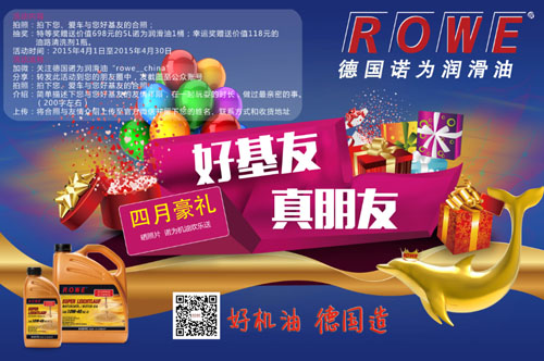 動(dòng)動(dòng)手指,簡(jiǎn)單易行,留張與好基友跟愛(ài)車(chē)的照片,發(fā)到我們的微信賬號(hào)中,您就有機(jī)會(huì)獲得由諾為潤(rùn)滑油免費(fèi)提供價(jià)值698元的高端機(jī)油!