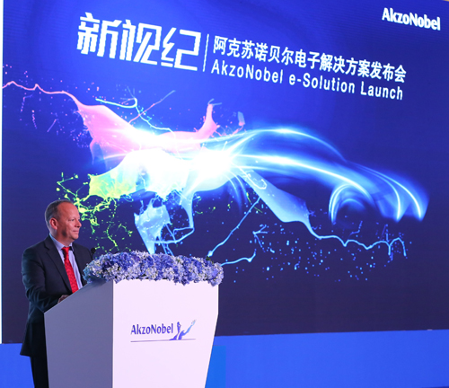 阿克蘇諾貝爾汽車修補漆戰(zhàn)略市場業(yè)務集團董事總經(jīng)理Simon Parker在電子解決方案發(fā)布會上致歡迎辭