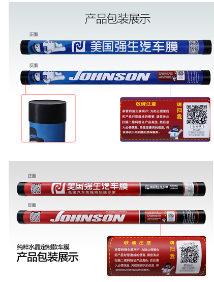 四、“Johnson Window Films(強生)”玻璃膜現有2種版本膜桶包裝(如下圖),其中紅色包裝為“存粹水晶定制款”,僅用于天貓銷售使用,消費者購買后請掃膜桶上唯一二維碼進行防偽查詢,并進行質保登記,以便享受完整的質保服務。