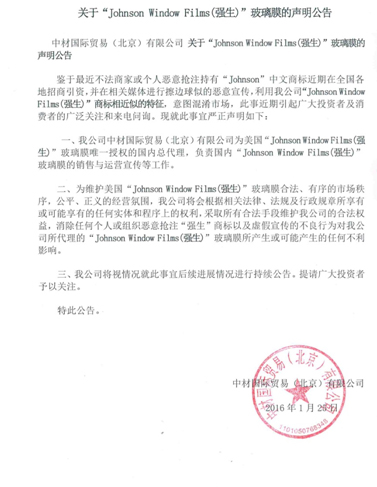 二十多年來,中材國際貿易(北京)有限公司一直為美國“Johnson Window Films(強生)”玻璃膜唯一授權的國內總代理,每卷膜都是100%原裝進口,有海關單號可查。現有不法商家或個人惡意搶注持有“Johnson”中文商標近期在全國各地招商引資,并在相關媒體進行擦邊球似的惡意宣傳,利用 “Johnson Window Films(強生)”商標相近似的特征,意圖混淆市場。鑒于該行為已引起廣大投資者及消費者的困擾,對“Johnson Window Films(強生)”玻璃膜造成了不好的影響。現就此事宜嚴正聲明如下: