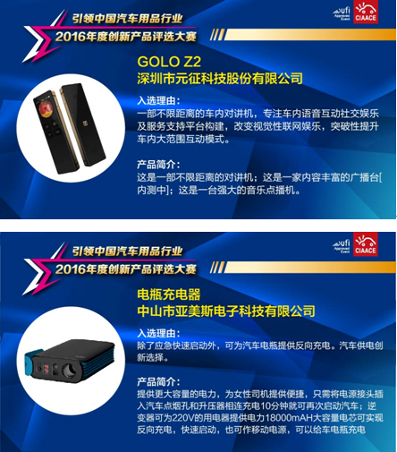 本屆評選與前兩屆相比獲得了更熱烈的響應,吸引了來自全國各地的7156多個參賽產品進行角逐,經過初選,367款產品進入評選范圍,由專家評委會的10位資深專家歷時15天審核選出21款產品入圍復選,最終有兩大類8款產品脫穎而出,獲得“2016引領中國汽車用品行業年度創新產品大賽“的年度創新獎。獲獎產品名單如下(排名不分先后)