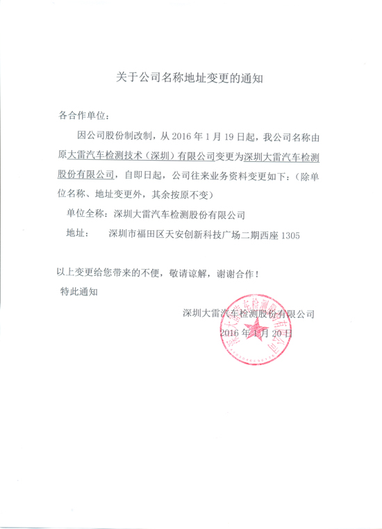 深圳大雷汽車檢測股份有限公司名稱地址變更的通知