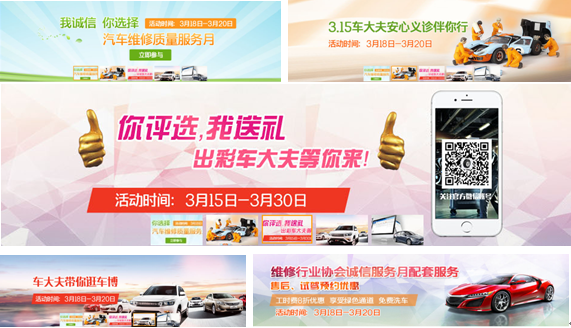 在活動開始前(3月10日)在“無錫修車網”首頁、及活動頁面更新了相關3.15活動的活動介紹內容進行推廣:包括首頁4張滾動宣傳圖片;及車大夫現場義診、微信抽獎、誠信倡議書、維修記錄查詢及東方汽車城活動的詳細內容介紹頁面。