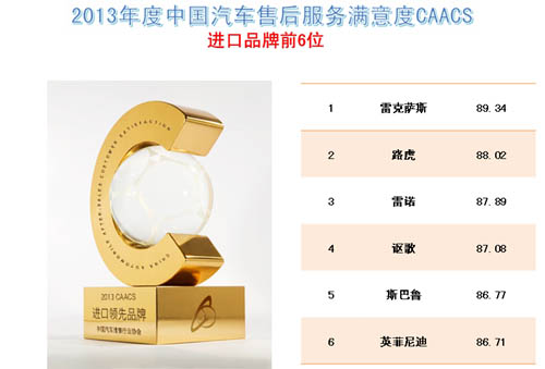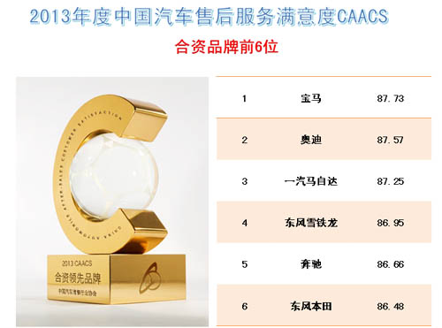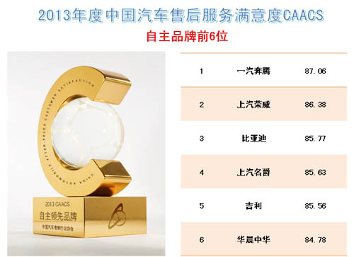 2013年9月27日,2013年度中國汽車售后服務客戶滿意度調查(CAACS,簡稱卡思調查)發布會在北京召開。結果顯示2013年度中國汽車售后服務客戶滿意度整體得分85.80分,較上一年略有上升。其中自主品牌售后服務滿意度提升較大,分值從上一年的83.75分上升至85.07分,隨著汽車消費理性回歸,自主汽車品牌快速成長,縮減了在技術、品牌、服務上差距。但進口品牌滿意度卻出現3年來的首次下滑,主要由于專業性和服務費用合理性方面客戶滿意度下滑。排名方面,雷克薩斯以89.34分位居進口品牌榜首,其在人性化、公開性、專業性方面表現突出。寶馬以87.73分位列合資品牌榜首,在專業性、人性化方面滿意度有明顯優勢。一汽奔騰以87.06分成為自主品牌中滿意度程度最高的品牌。結果還表明接近35%的4S店客戶在二保過后將會流失,更多的客戶愿意選擇去綜合修理廠和快修連鎖店。