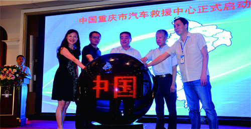 出席會(huì)議領(lǐng)導(dǎo)(右起:重慶市應(yīng)急救援指揮中心賀奎、中國(guó)汽車維修行協(xié)會(huì)張京偉、重慶市道路運(yùn)輸管理局王起、重慶市交通行政執(zhí)法總隊(duì)陳亞?wèn)|、重慶市金鳳電子信息產(chǎn)業(yè)園聶惠)為啟動(dòng)儀式揭幕