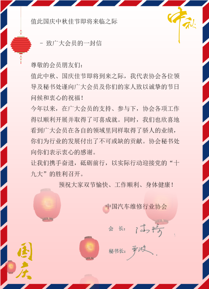 中國汽車維修行業協會陳琦會長致廣大會員的節日賀信