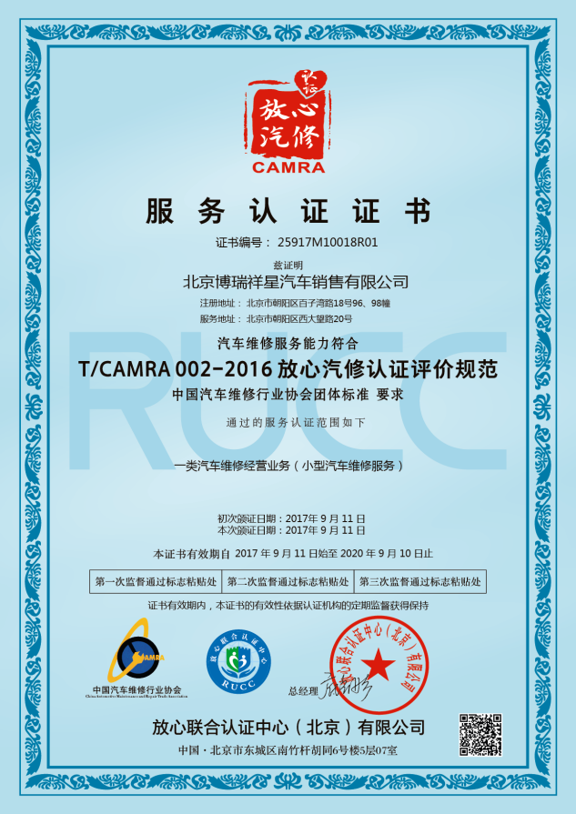 放心汽修認證證書