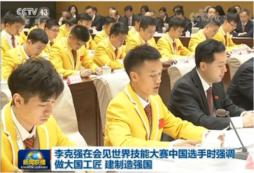 在與團員們合影留念并參觀參賽項目成果展后,李克強主持召開座談會。會上,人力資源和社會保障部負責人匯報了參賽情況, 其中,杭州技師學院的蔣應成作為獲獎選手代表之一,進行了《懷匠心踏精技之路 揚技能展青春風采》為主題的發言: