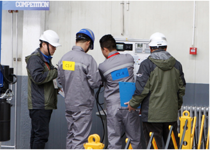 每個參賽隊由2名選手組成,其中一名選手操作,另外一名選手則進行安全監督。為了識別,本次大賽的選手背后藍、黃號標加以識別。當操作的選手有遺漏的安全操作或者違規操作時,負責安全監督的選手必須加以提醒。為了確保比賽的公正,除了制定嚴格的抽簽規則、學生比賽期間封閉管理外,本次大賽的故障排除賽項設置了A、B卷,最大程度降低了作弊的可能。所以,本次比賽每組選手的成績都是他們真實能力的體現。
