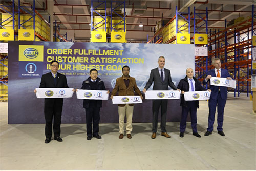 海拉貿(mào)易(上海)有限公司總經(jīng)理Philippe Thegner先生(右2),海拉全球物流總監(jiān)Stefan Van Dalen(右1),海拉亞太售后市場(chǎng)物流總監(jiān)Deepak Prasanth先生(右4)等領(lǐng)導(dǎo)們共同剪彩
