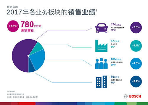 德國(guó)斯圖加特、路德維希堡——據(jù)財(cái)報(bào)初步數(shù)據(jù)顯示,博世集團(tuán)2017年銷售額實(shí)現(xiàn)了6.7%的大幅增長(zhǎng),達(dá)780億歐元。在調(diào)整匯率影響后,總銷售額增長(zhǎng)了8.3%,其中匯率影響約12億歐元。博世集團(tuán)董事會(huì)主席沃爾克馬爾·鄧納爾博士在路德維希堡舉行的集團(tuán)業(yè)績(jī)初步數(shù)據(jù)媒體溝通會(huì)上表示,“2017年,我們銷售額再創(chuàng)新高,業(yè)務(wù)增長(zhǎng)超出預(yù)期目標(biāo),利潤(rùn)率也得到了進(jìn)一步提高。”博世憑借其創(chuàng)新實(shí)力以及對(duì)互聯(lián)戰(zhàn)略的專注實(shí)現(xiàn)了集團(tuán)的持續(xù)增長(zhǎng)。鄧納爾博士表示,“博世很早就意識(shí)到互聯(lián)業(yè)務(wù)的無(wú)限潛力,如今正將互聯(lián)戰(zhàn)略轉(zhuǎn)化為實(shí)實(shí)在在的業(yè)績(jī)。”2017年,博世集團(tuán)息稅前利潤(rùn)達(dá)到53億歐元,這意味著息稅前利潤(rùn)率達(dá)到6.8%。博世集團(tuán)首席財(cái)務(wù)官及董事會(huì)副主席Stefan Asenkerschbaumer博士指出:“博世在傳統(tǒng)核心業(yè)務(wù)領(lǐng)域取得的成功為我們成為領(lǐng)先的物聯(lián)網(wǎng)技術(shù)及智能交通解決方案供應(yīng)商提供了資金保障。”展望2018年,博世預(yù)見有眾多機(jī)會(huì)可將互聯(lián)技術(shù)帶到更多領(lǐng)域,諸如工廠、樓宇、城市以及交通出行的變革。鄧納爾博士同時(shí)強(qiáng)調(diào)在企業(yè)數(shù)字化戰(zhàn)略轉(zhuǎn)型過(guò)程中企業(yè)文化的轉(zhuǎn)變同樣十分重要。
