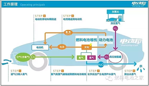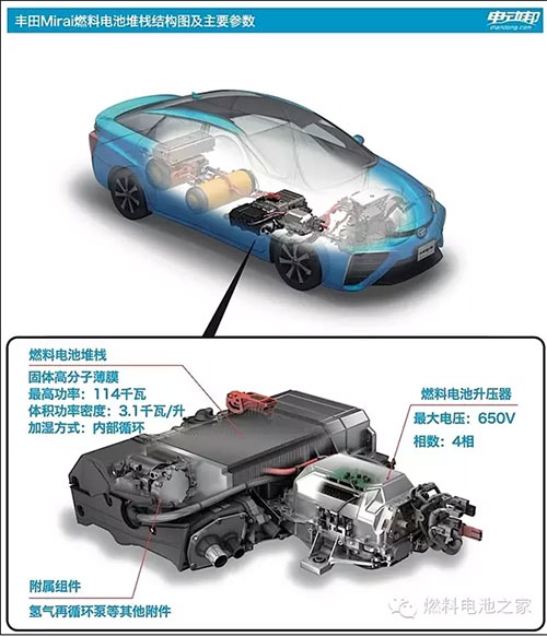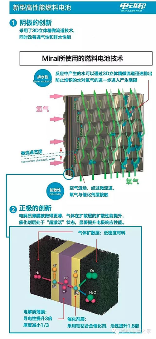 因?yàn)闅浞肿芋w積小,可以透過(guò)薄膜的微小孔洞游離到對(duì)面去,但是在穿越孔洞的過(guò)程中,電子被從分子上剝離,只留下帶正電的氫質(zhì)子通過(guò),氫質(zhì)子被吸引到薄膜另一側(cè)的電極與氧分子結(jié)合。電解質(zhì)薄膜兩側(cè)的電極板將氫氣拆分成氫離子(正電)和電子、將氧氣拆分成氧離子(負(fù)電)和電子,電子在電極板之間形成電流,兩個(gè)氫離子和一個(gè)氧離子結(jié)合成為純水,是反應(yīng)的廢物。所以本質(zhì)來(lái)講,整個(gè)運(yùn)行過(guò)程就是發(fā)電過(guò)程。因此Mirai是純電動(dòng)車,燃料電池堆棧代替的就是厚重且充電效率低下的鋰離子電池組。