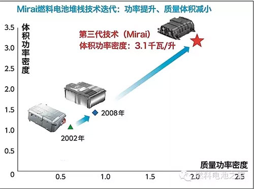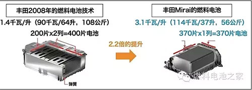 豐田Mirai搭載的燃料電池堆棧是由370片薄片燃料電池組成的,因此被稱為“堆棧”,一共可以輸出114千瓦的發(fā)電功率。此前我們也分析了大眾集團(tuán)的燃料電池技術(shù),結(jié)構(gòu)基本類似。豐田的燃料電池堆棧經(jīng)歷了十幾年的技術(shù)優(yōu)化,形成了自己的特色結(jié)構(gòu),比如3D立體微流道技術(shù),通過(guò)更好地排出副產(chǎn)物水,讓更多空氣流入,有效改善了發(fā)電效率。所以整個(gè)堆棧的發(fā)電效率達(dá)到了世界先進(jìn)水平,達(dá)到了3.1千瓦/升,比2008年豐田的技術(shù)整整提升了2.2倍。