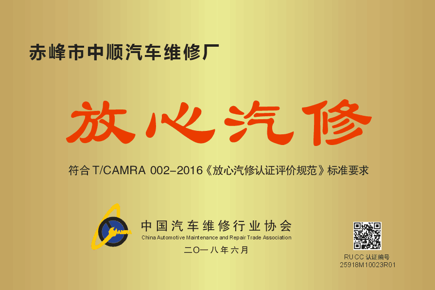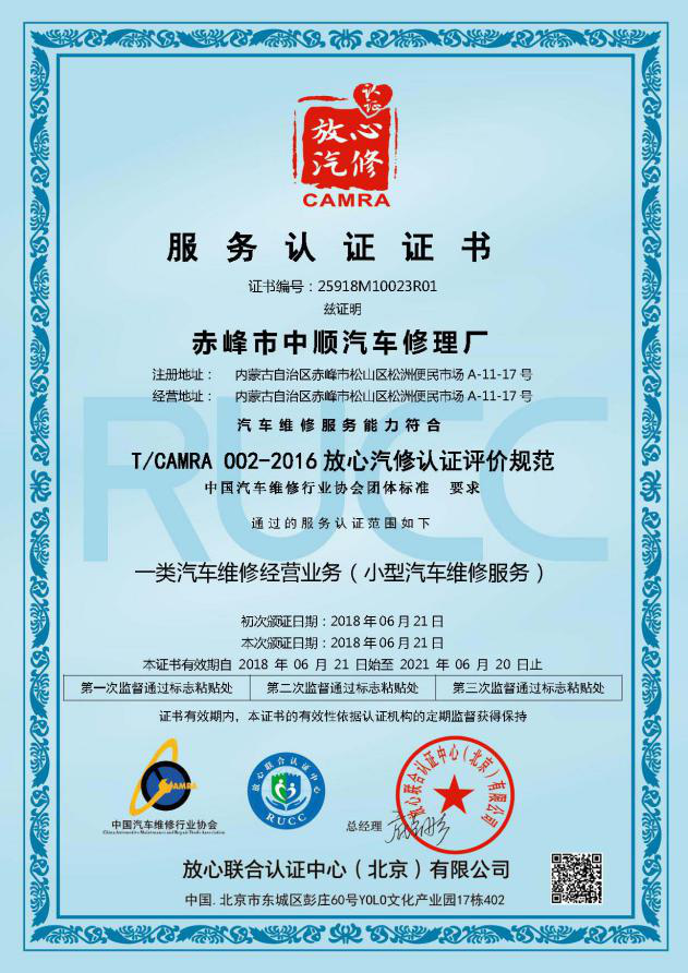 放心汽修認證證書