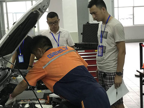 據了解,24日的比賽是最激烈的實操比賽,比賽進入白熱化階段,二個競賽項目共有15名維修技師參加。新能源汽車的故障排除這組,他們使出渾身解數,爭分奪秒地檢測新能源汽車的故障、判斷故障,并在排除故障、修理技能等方面各顯神通,從而決出最終名次。二個項目每個比賽工位均有兩位裁判在旁邊記錄評估選手操作的規范性和準確性。外面正下大雨,天氣比較悶熱,選手們汗流浹背,但都面不改色,專心致志地投入比賽。